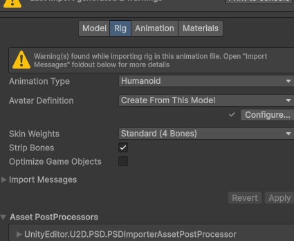 1. fbx클릭 후 인스펙터에서 Rig을 선택. 애니메이션 타입을 확인(저같은 경우 휴먼으로변경) 후 Apply 후 Configure.. 클릭하여 확인 하기.
