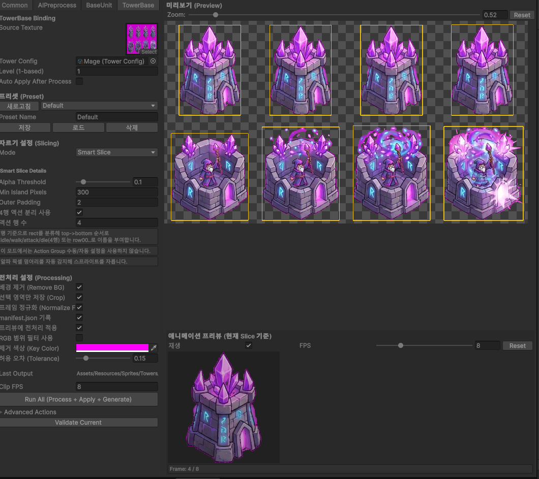 영웅/적/병영유닛 3개를 모두 세팅하고 이제 타워도 스프라이트 툴로 만들기 위해 타워용 스프라이트 툴 개선. 및 적용 스샷 올립니다.